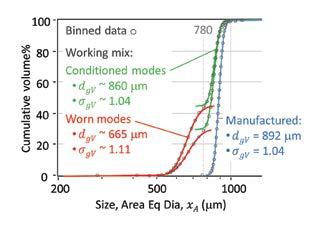 Figure 3. Size distributions of as-manufactured and working-mix CW32 samples. Bimodal working mix data show the range of three samples: conditioned modes > 780, worn modes < 780 μm.