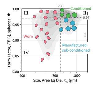 Figure 4. Size/shape quadrant map: I) as-manufactured, sub-conditioned; II) conditioned; III) worn and well rounded; IV) worn with shape distortion. Quadrant boundary thresholds (xA = 780 μm; FF = 0.97) are based on multimodal size and shape analyses.