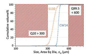 Figure 5. Size specification using J2441 adapted to equivalent area diameter. Quantile specifications (Q) describe the allowable size range (non-shaded).