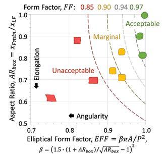 Figure 7 illustrates form factor limits using the same two examples of as-manufactured media that are shown in Figure 5. The Form Factor provides a quantitative measure of shape that combines the effects of elongation and angularity illustrated in Figure 6.