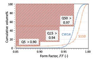 Compared to the CW32 working mix media discussed in the body of the paper, shape control of finer media (e.g., CW14 and S110) is more challenging. In this example, the Q50 limit is a challenge for conditioning of as-manufactured CW; and the Q5 limit is a challenge for shape classification of cast media. Further refinement of Form Factor quantile limits can be developed for specific peening applications.
